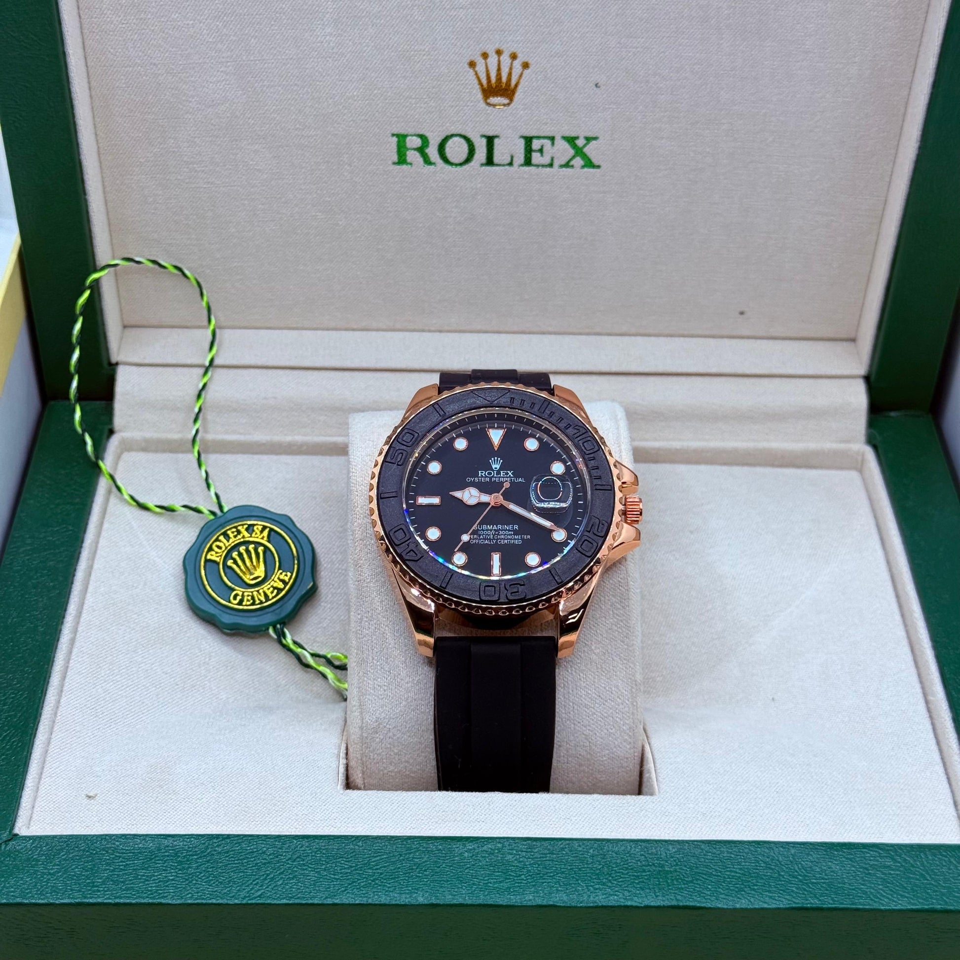 Rolex strap rose gold with black rotating dial with master lock